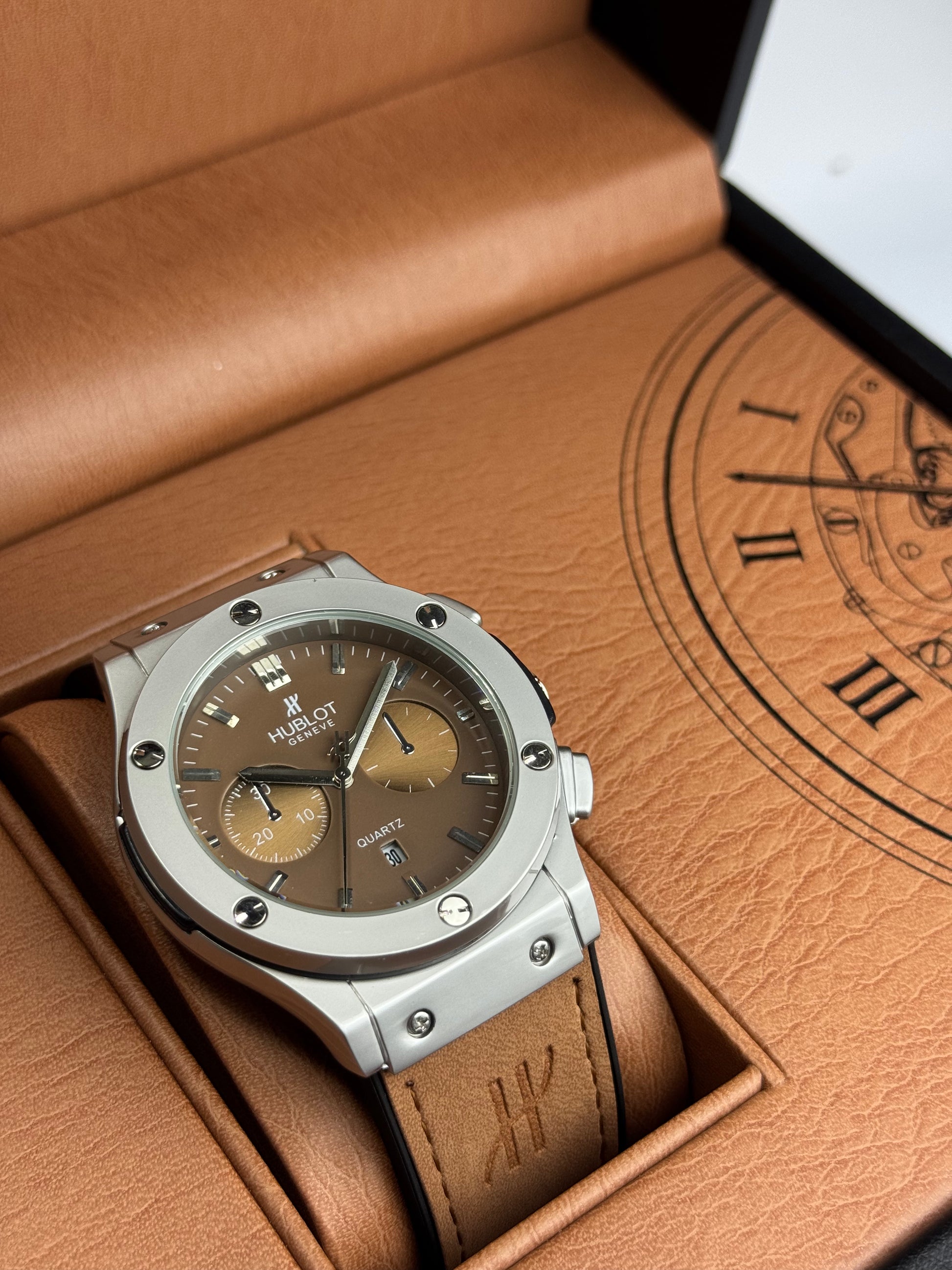 Hublot Leather Strap – Combining bold design with refined comfort, this Hublot timepiece pairs its striking case with a premium leather strap for a touch of elegance. The supple strap enhances wearability while maintaining the brand’s signature fusion of luxury and innovation. With its precise movement, durable build, and distinctive aesthetic, the Hublot on leather becomes a perfect balance of sophistication and modern style — a watch made to stand out in any setting.